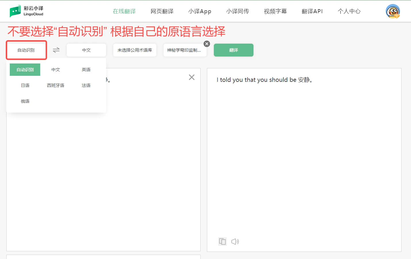 不管是夹杂了哪种第二语言,请在选择原语言时不要默认为“自动识别”,手动选择原语言。